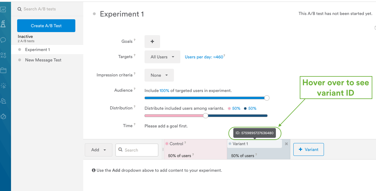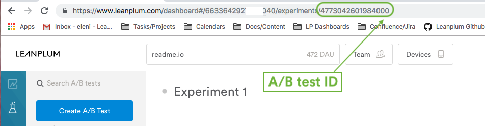 Each event tracked for A/B tests in Leanplum includes the abTestId, a unique identifier for the test that corresponds to the value in the URL when viewing it in the A/B test editor (dashboard).